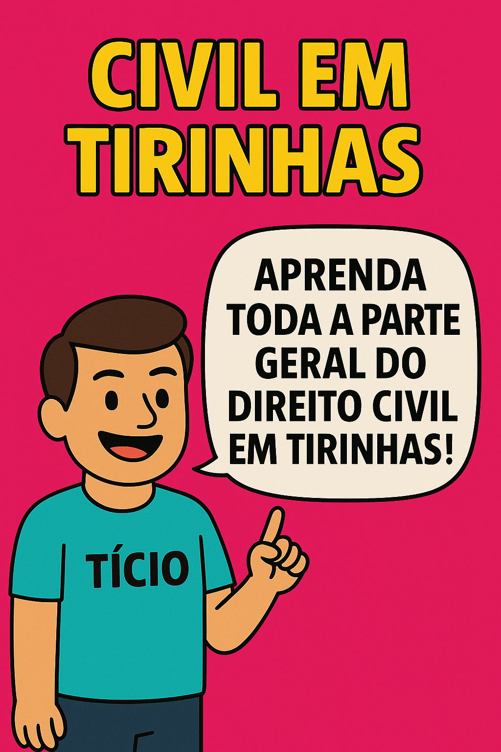 O Civil em Tirinhas é um material em PDF ilustrado que explica toda a Parte Geral do Direito Civil (Pessoa Natural, Pessoa Jurídica, Bens, Negócio Jurídico, Prescrição etc...) com tirinhas inteligentes, divertidas e assertivas.