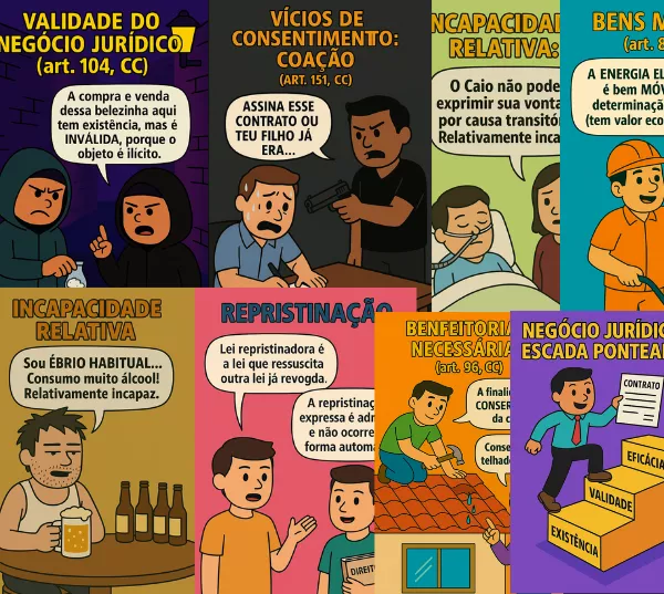 Nosso cérebro memoriza melhor imagens do que textos longos. É por isso que cada tirinha foi criada de forma visual, didática e intencional – você não vai apenas “ler”, vai enxergar o Direito Civil acontecendo diante de você.